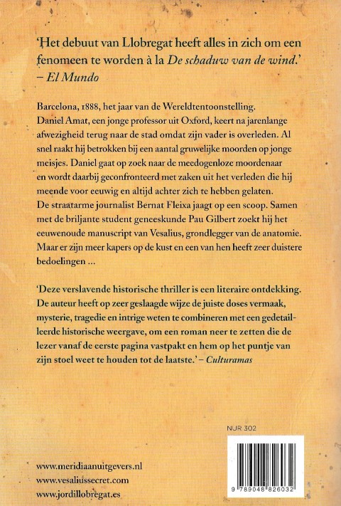 ''Barcelona, 1888, het jaar van de Wereldtentoonstelling. Daniel Caralt keert terug naar de stad na het overlijden van zijn vader, maar raakt betrokken bij een zaak waarin jonge meisjes op gruwelijke wijze worden vermoord. Bernat Fleixo, straatarme journalist, wil graag een scoop. Samen met Pau Gilbert, student geneeskunde, gaat hij op jacht naar het boek over anatomie van Vesalius - de Nederlander Andries van Wesele. Maar er zijn meer kapers op de kust en een van hen heeft zeer duistere bedoelingen ...''